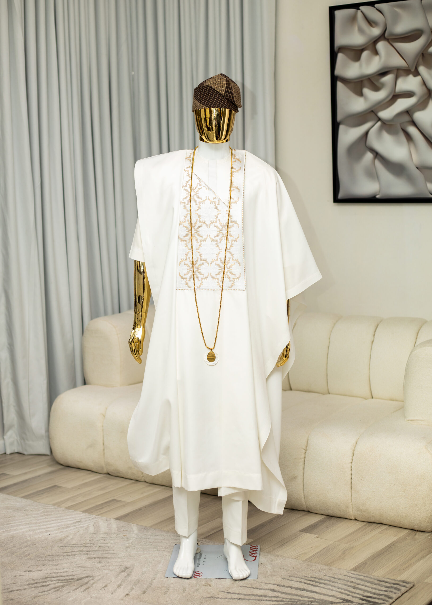 An off-white agbada piece, a kaftan top, and a pair of matching trousers;