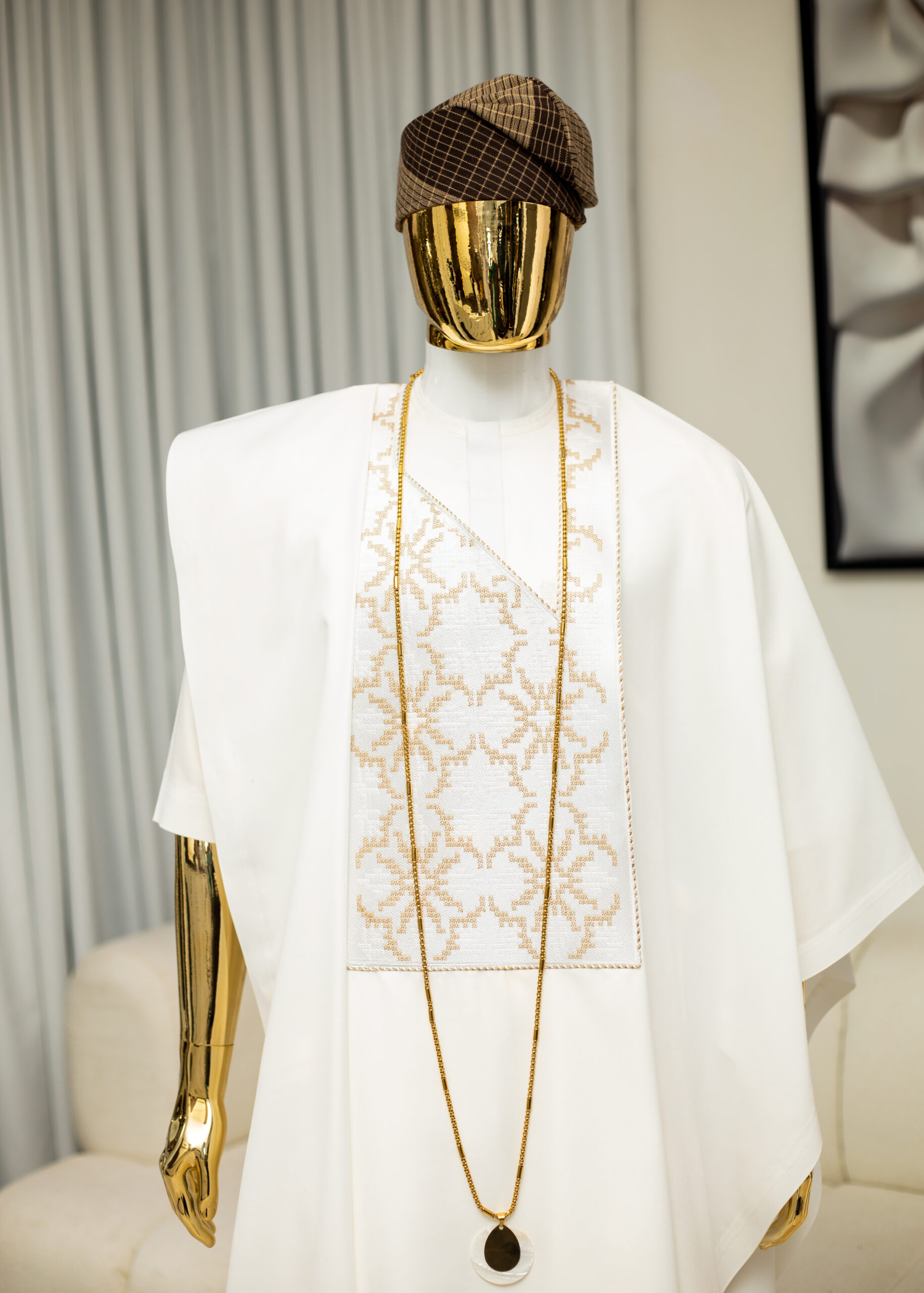 The agbada piece has a patterned off-white embroidery design (monogram),