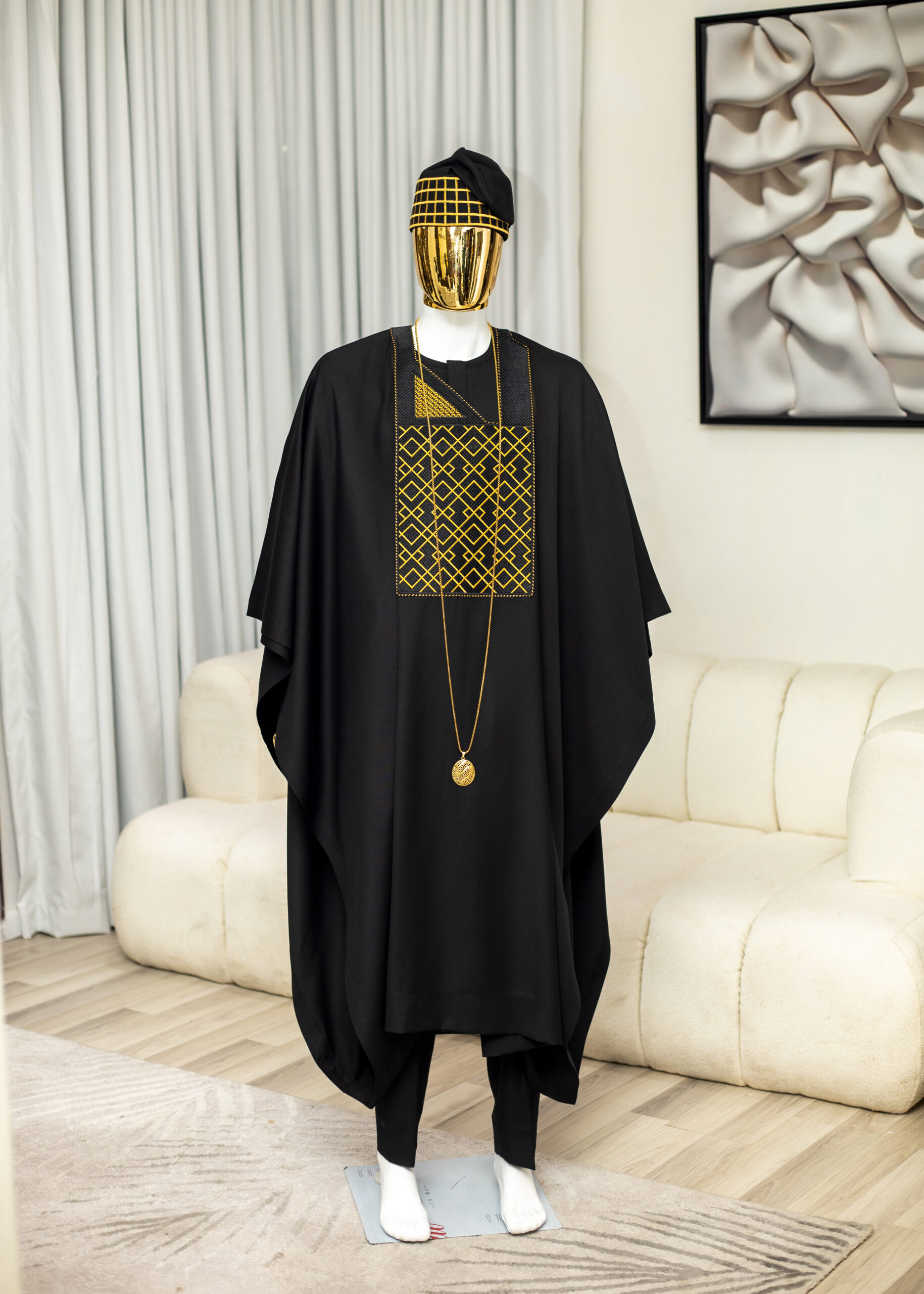 A black agbada piece, a kaftan top, and a pair of matching trousers;
