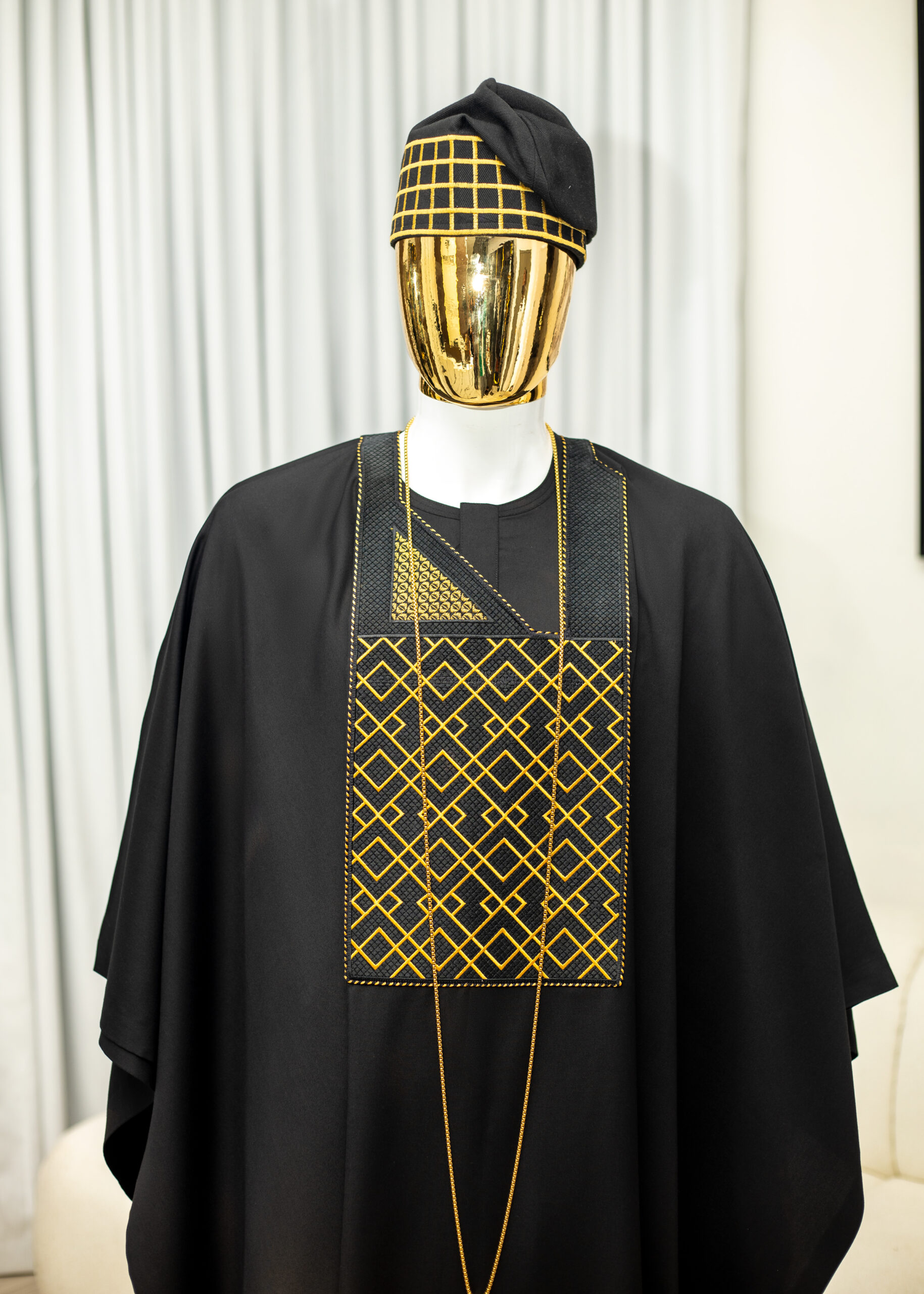 The agbada piece has a patterned gold and black embroidery design (monogram),