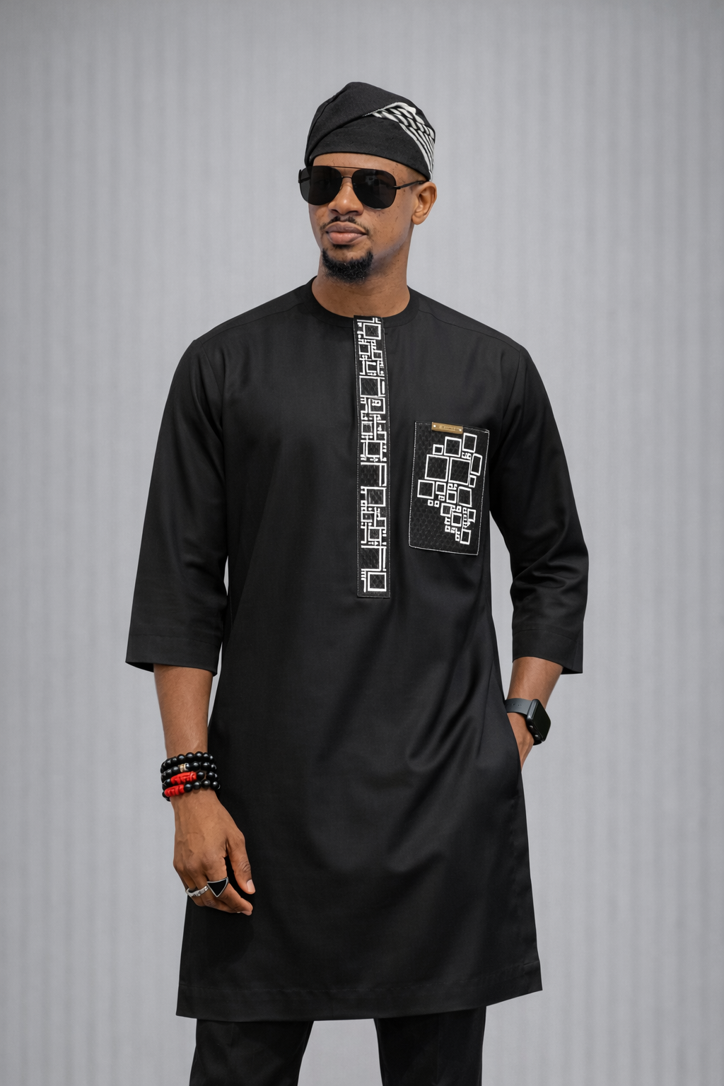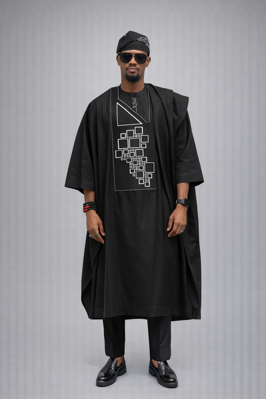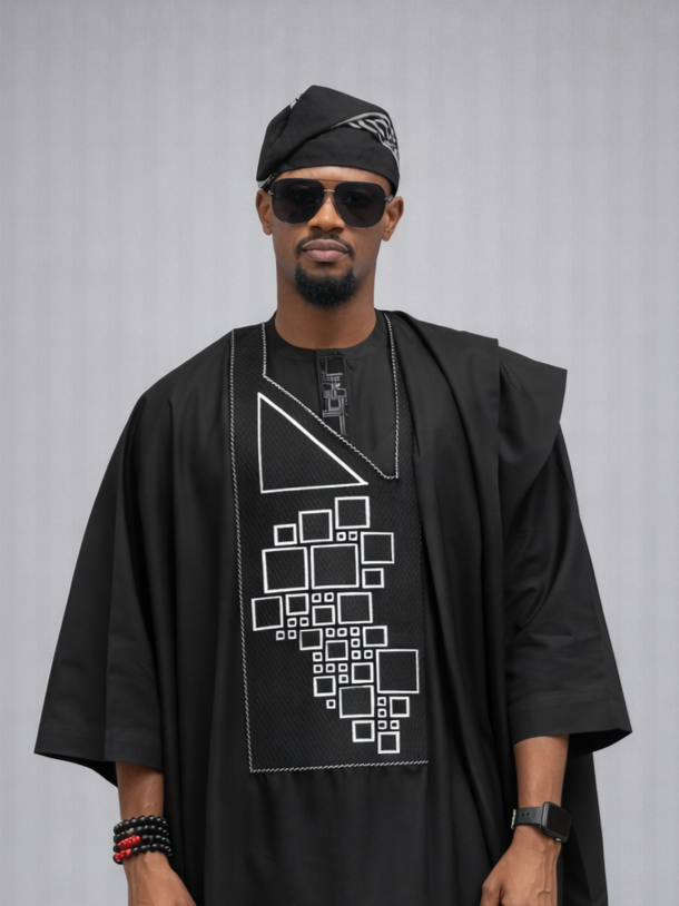 The agbada piece has a patterned black embroidery design (Monogram),