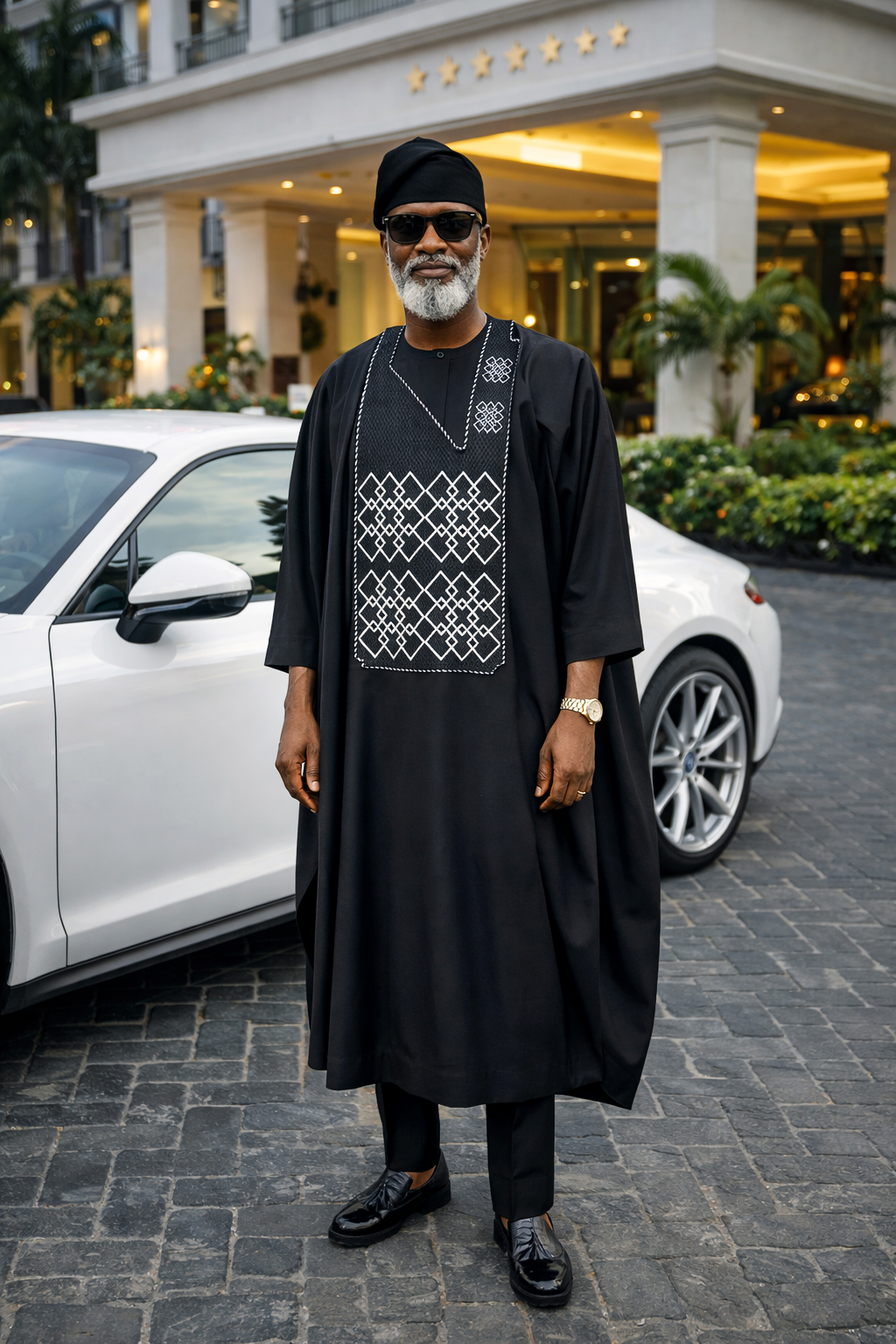 A black agbada piece, a kaftan top, and a pair of matching trousers;