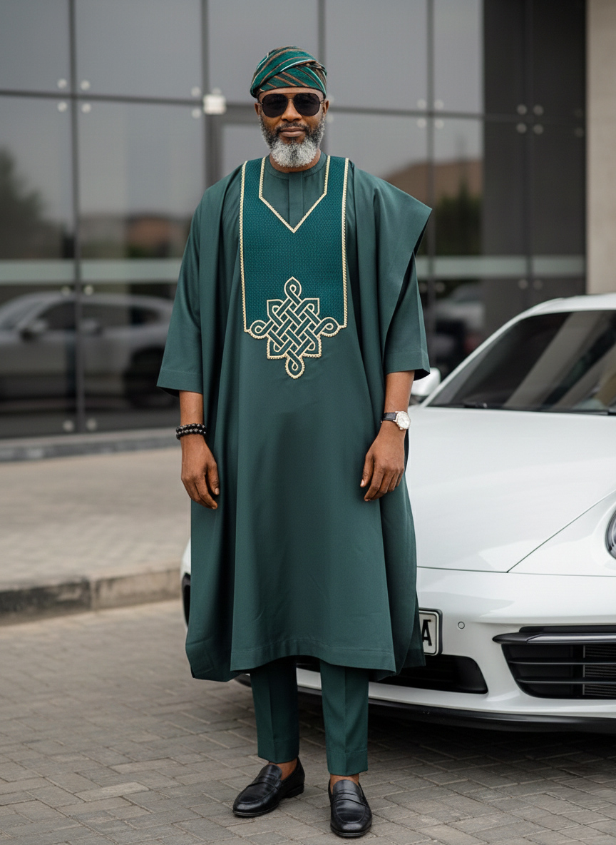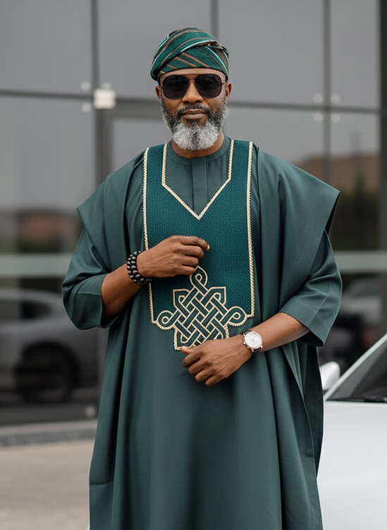 The agbada piece has a patterned green embroidery design (Monogram),