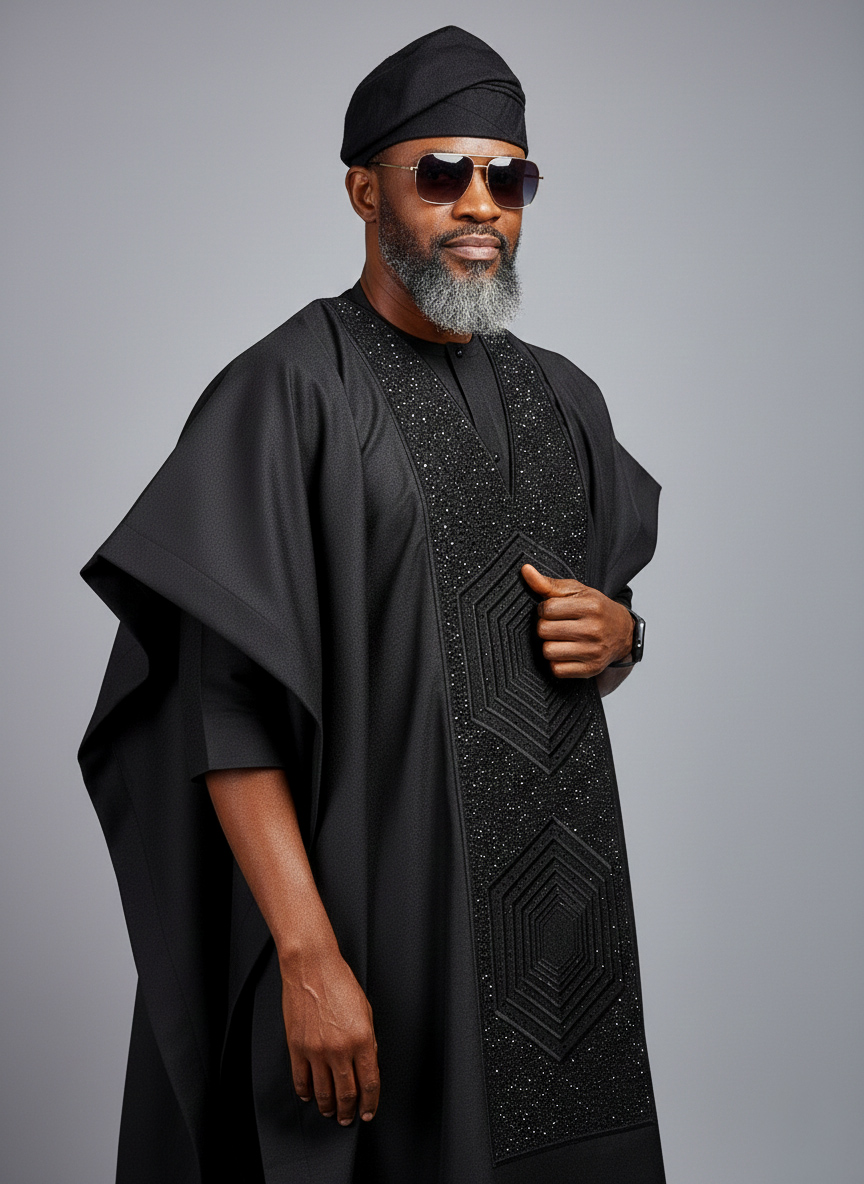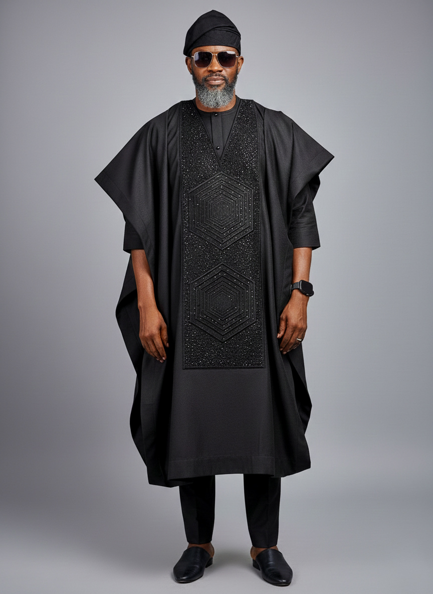 A black agbada piece, a kaftan top, and a pair of matching trousers;