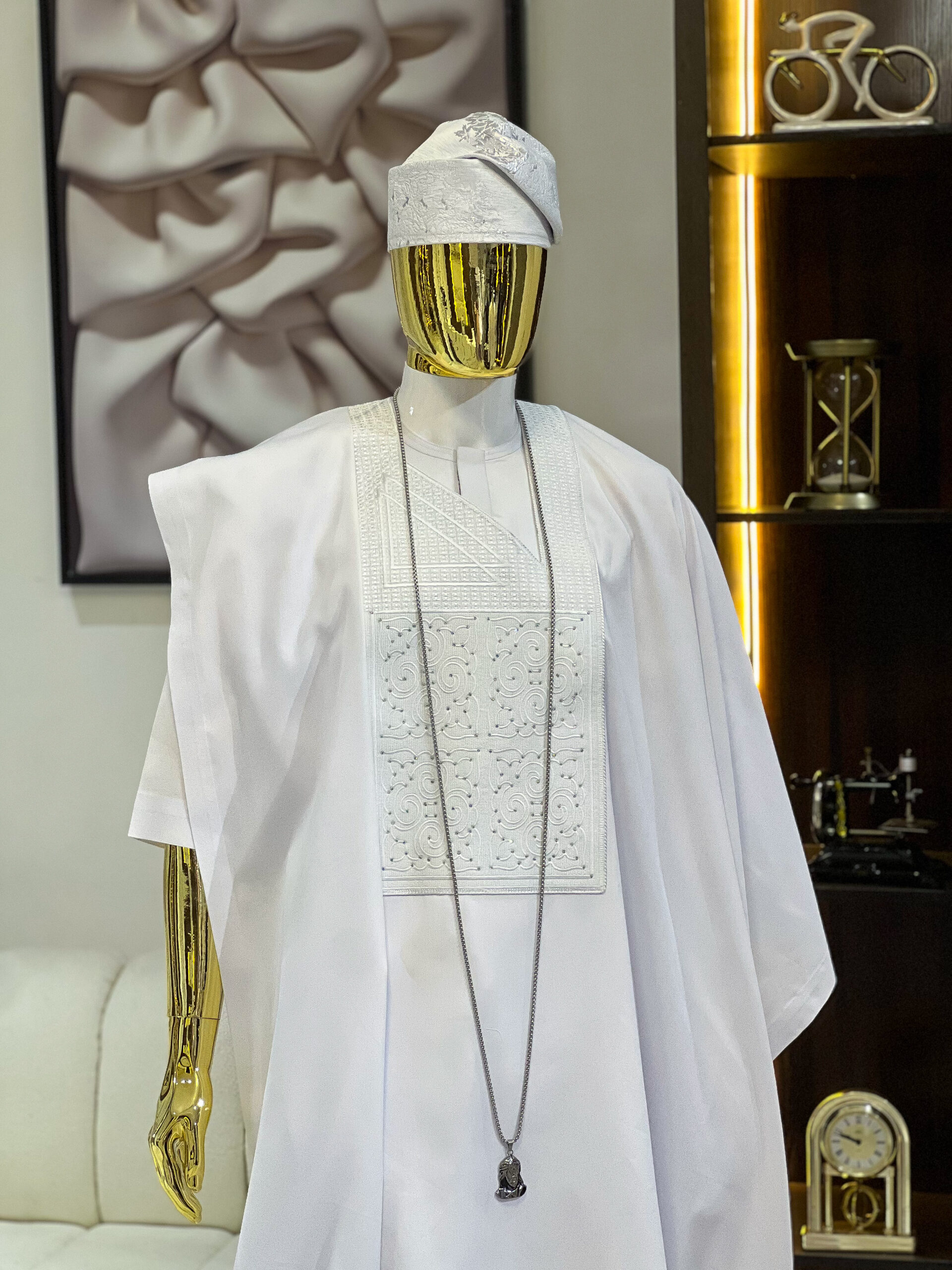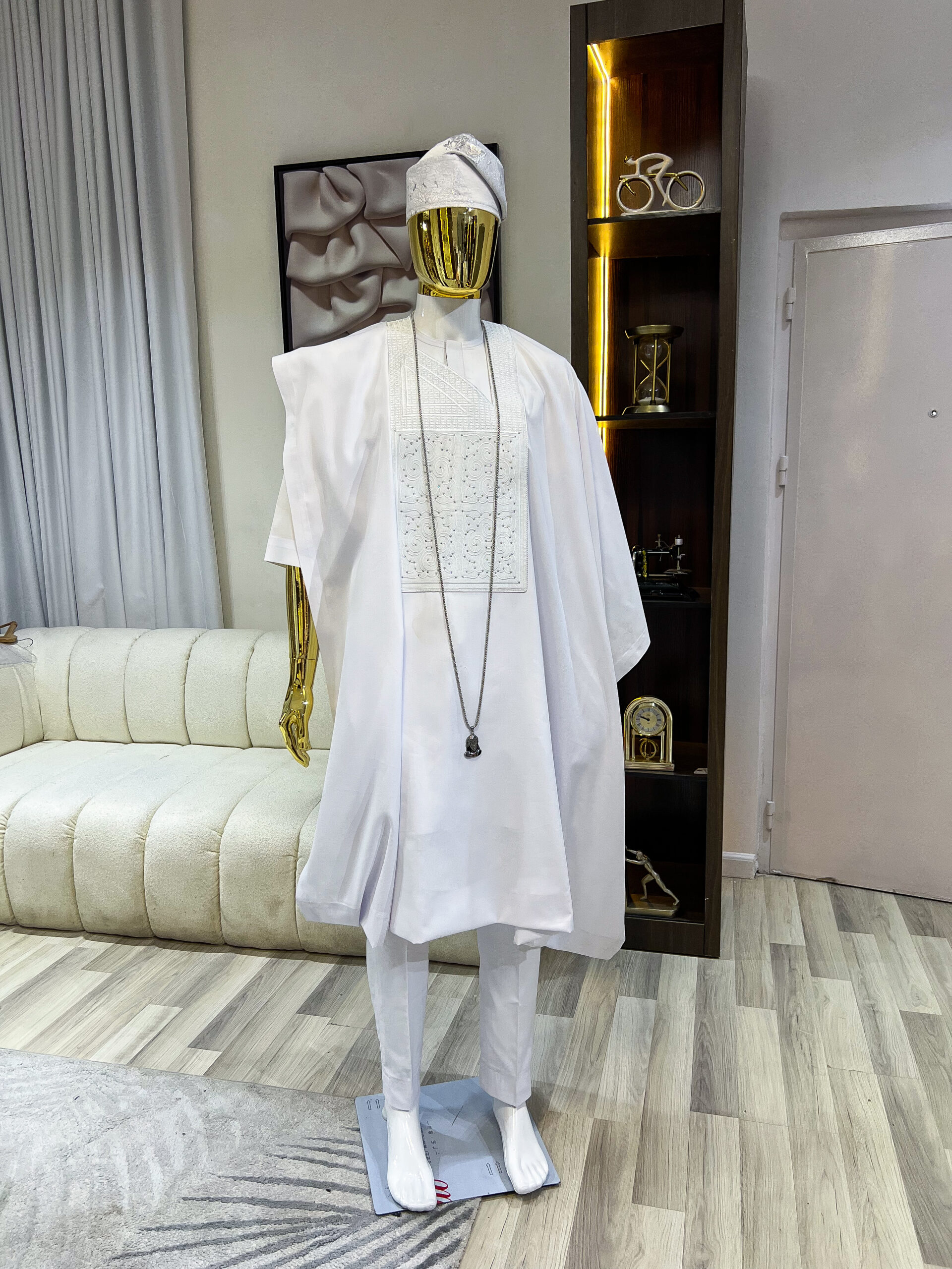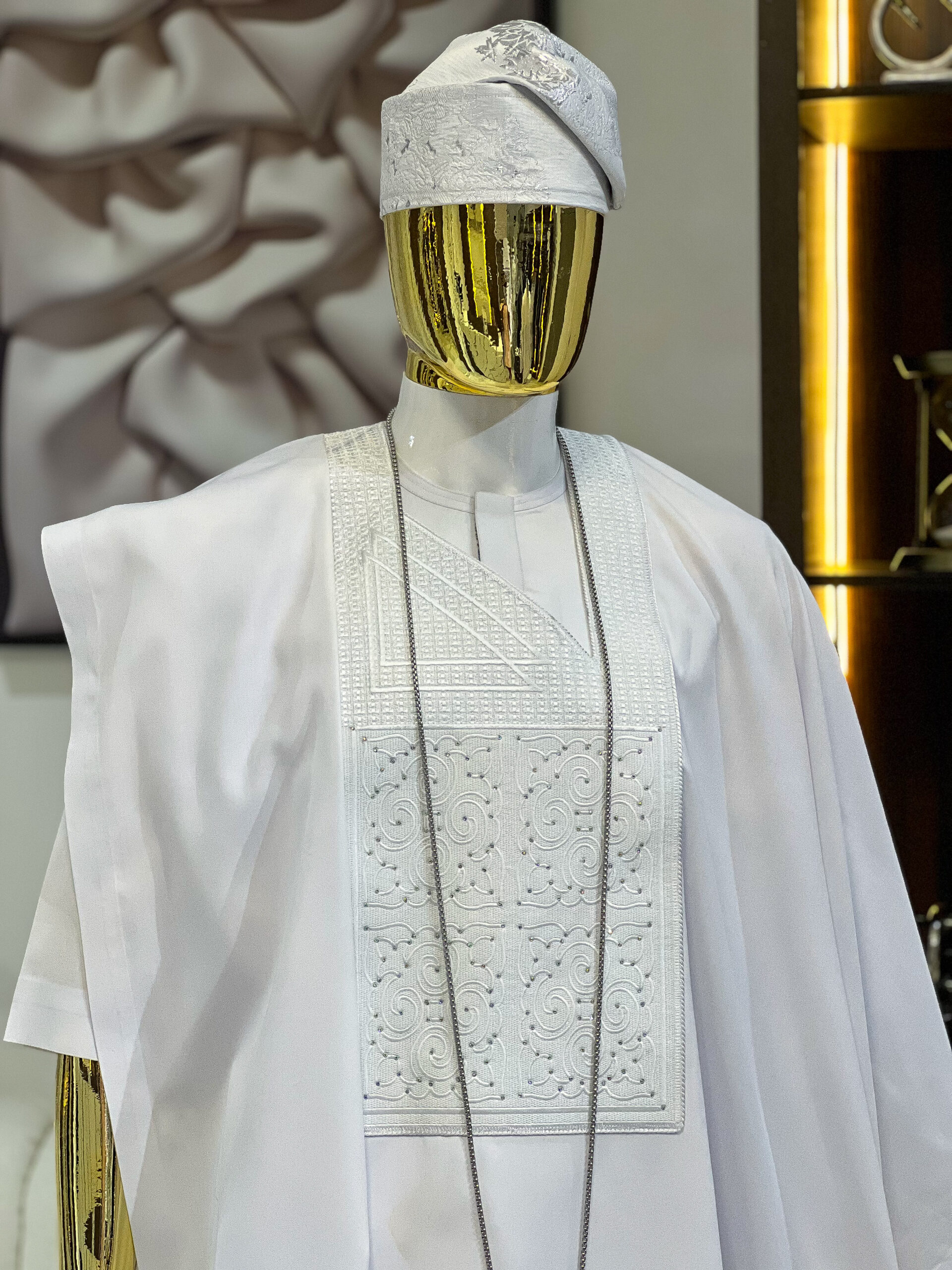 The agbada piece has a crystallized white embroidery design (Monogram),