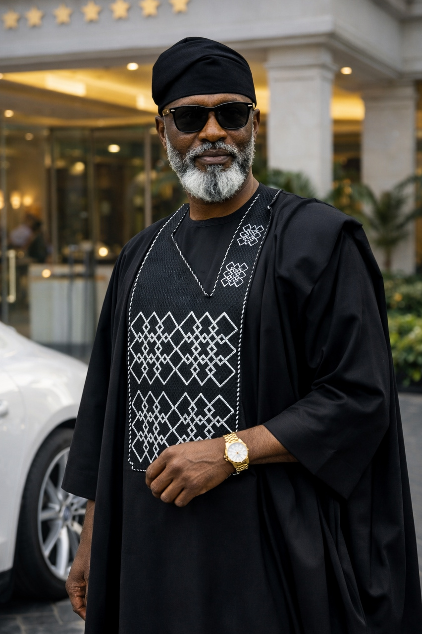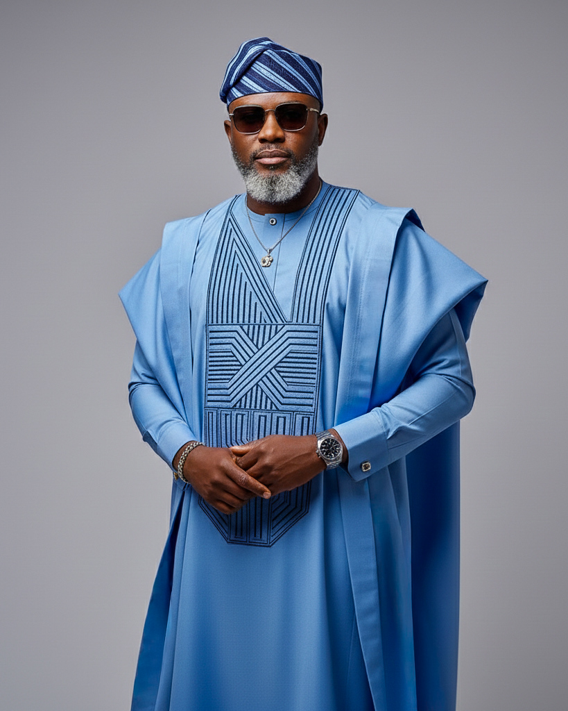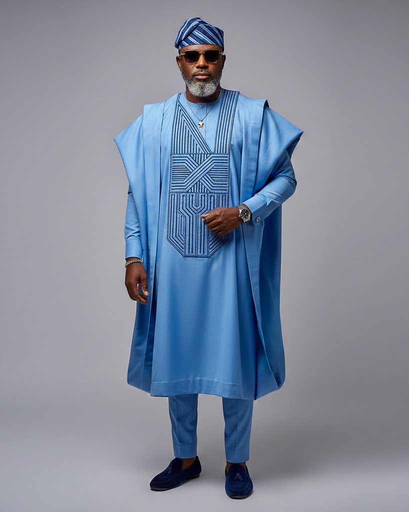The agbada piece has a patterned blue embroidery design (Monogram),