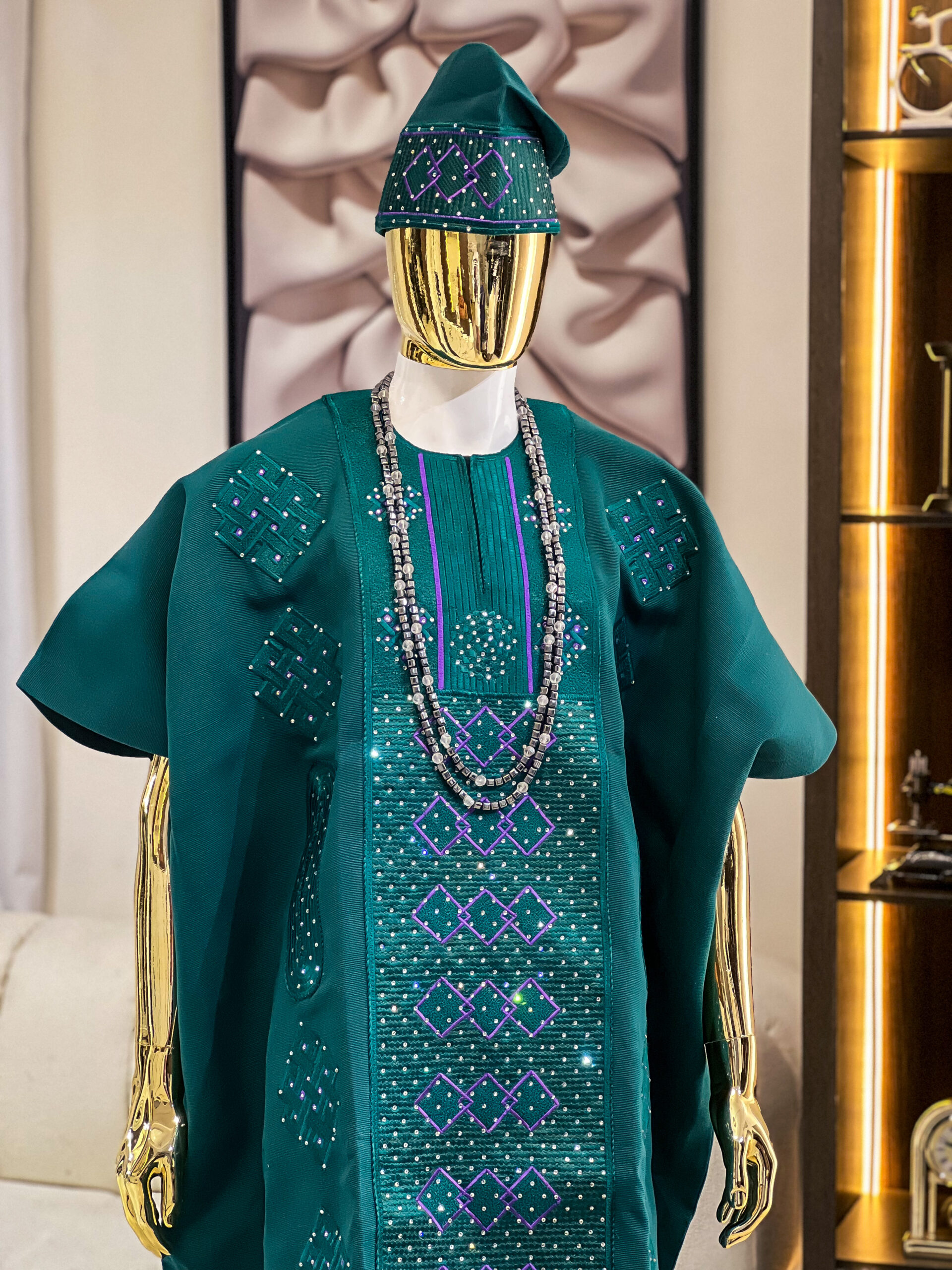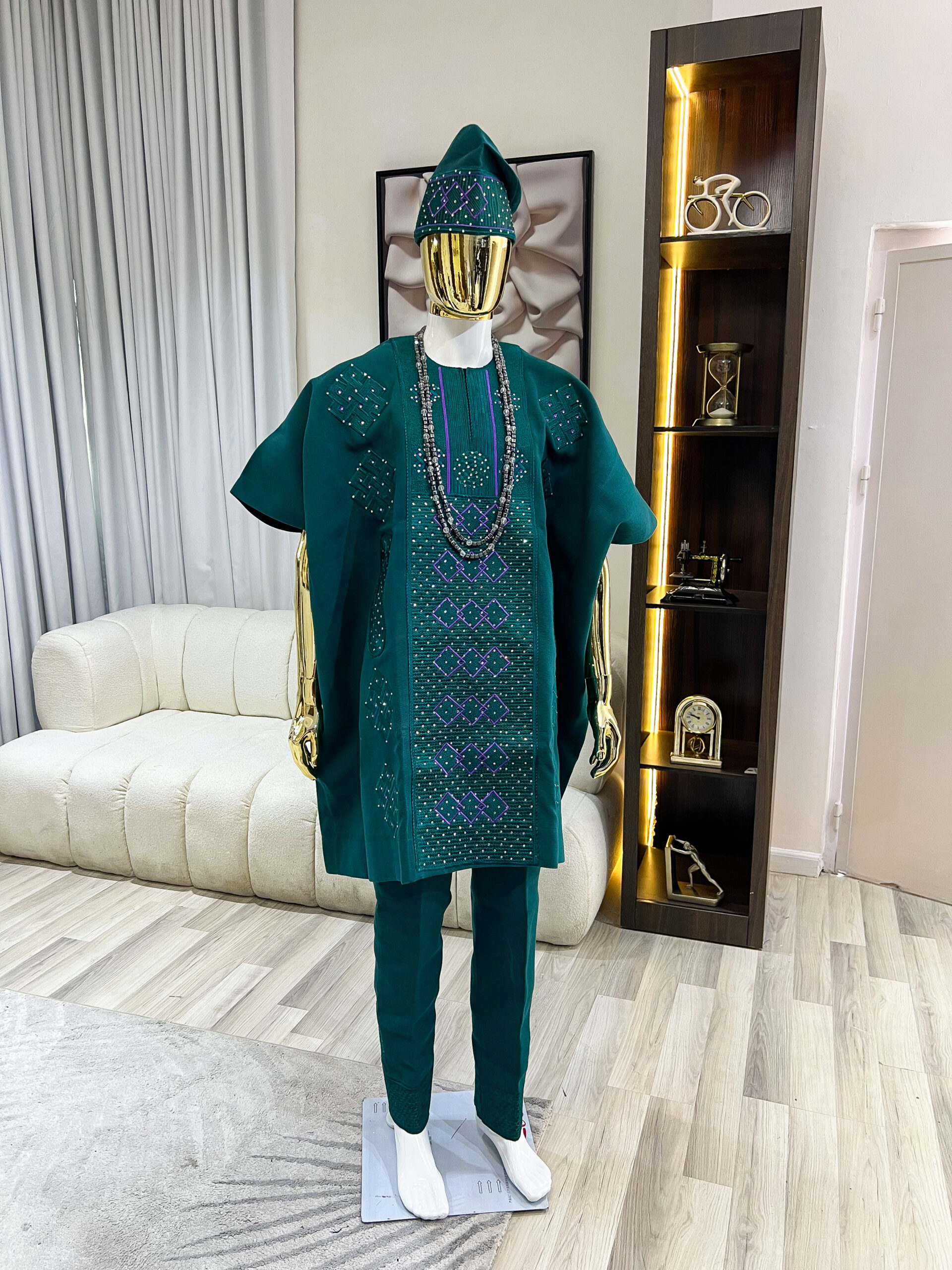 A green asooke danshiki top, a matching trousers, and a matching bendable cap. The danshiki top has a huge, crystalized, embroidery design (Green – Manual), while the trousers and cap also have the same specs of embroidery design.